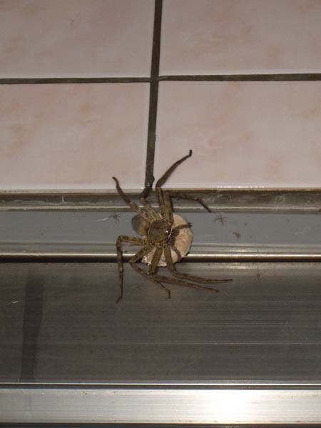 但昨天有一隻就被我們掃地出門。 在廚房見到巴掌大的高腳蜘蛛並不稀奇,噁心的是牠正在育幼,抱著一個像桂冠芝麻湯圓那麼大的卵囊 ~"~ 。當我調高光線對比、打閃燈照相時,才發現原來卵囊已經開始孵化了,已經有十隻小蜘蛛跑出來分散在附近。