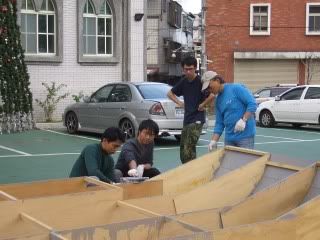 一直很好奇我們做的方舟的實體會長什麼樣,上個禮拜就下到地下室的「地下造船廠」去看方舟。銘偉和恩中,丁丁和俊儒,以及專業木工陳爸,忙進忙出,搬運木料、操作射釘槍、量尺寸、鋸木料、上白膠......躺在地上的則是數塊方舟模組船殼,光是在現場看到模組船殼的大小,不難想見這項工程的浩大,也幫忙搬了些木料還有幫忙穩定模版結構。我們以前從來沒有做過這種事,二十幾年來這是頭一回。