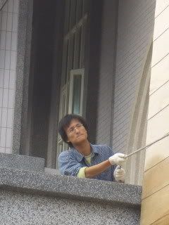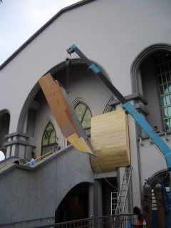 一個禮拜過後,就是昨天,禮拜天的下午,又跑去教會看看方舟怎麼樣了,看到方舟要上架組裝了!教會外的停車場,大家把模組抬出來,準備吊掛上牆組裝。由於配合外牆的樑柱空間,大家又把方舟各部模組進行了一些加工,鋸掉一些多出來的部份,由於已經組裝好的模組塊有角度,要鋸掉多餘的部份,並不好施力,所以我們都是鋸個大概的裂縫,接下來,男生拳頭一敲、無影腳一踹,多餘的木板和模組分家就大功告成。掛上吊車,把模組塊吊掛上去。從模組的組合看上去,這件工程的成品還真可愛。