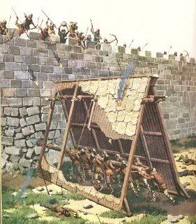 只是看著身邊的方舟模組,又有一群手執現代工具的「工人」(全都是我們自己人)穿梭其間,居然聯想到了 Discovery 曾經拍過的《古代超級武器》系列節目。那有一集是講到中世紀戰爭,攻城時使用的衝撞車,傳說衝撞車是極具威力的武器,僅次於遠距武器巨型投石機,而且結構厚實又有裝甲,要破壞它還有一定的困難度(這對我而言並不陌生,因為在打世紀帝國的時候常遇到 XD)。有六位工人決定在黎巴嫩附近的山上,現場重建、打造一台,好驗證當年羅馬軍團還有中世紀士兵使用衝撞車的心得。當年羅馬大軍朝猶太人位於山坡上的要塞打過來時,包圍要塞以後,羅馬的工兵在現場製造了好幾十台這種衝撞車,根據歷史,衝撞車一出動,城牆便如同摧枯拉朽般的被破壞,羅馬大軍成功攻下猶太人的堡壘。
