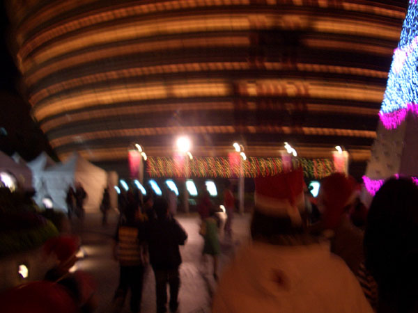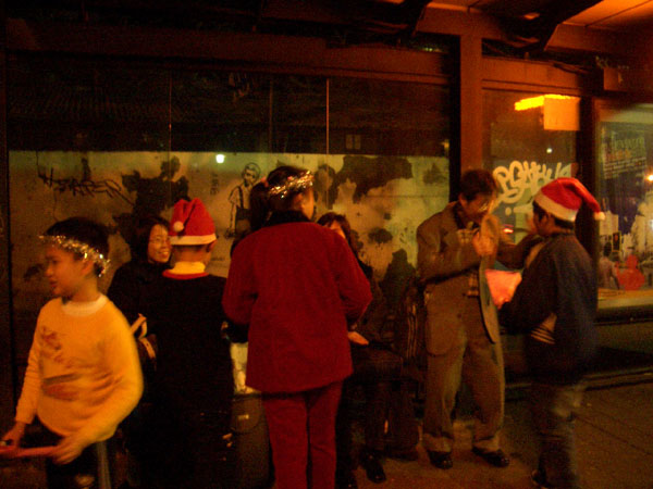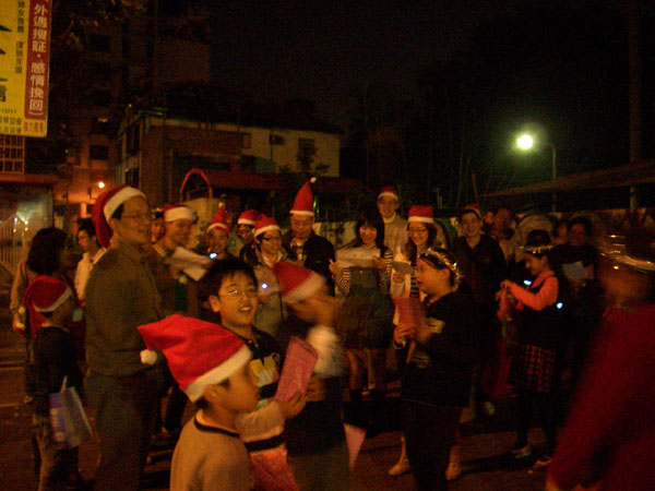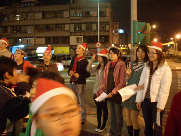 ,以前在教會報佳音的時候總是很懷念拜訪過的地方:目標人家(包括幾乎每年都有大學生和高中生團「佔據」的牧師館)、街頭巷尾、夜市、火車站、還有一次報到警察局去。能有機會第一次在台北街頭報佳音,加上我想逃離實驗室一個晚上,讓我相當期待想要瘋台北。準備好聖誕帽,一起走出教會,沿途我們遇到了辛苦的資源回收人員、等公車的路人、等紅燈的駕駛人、飲料店的工讀生、餐廳的顧客(還央求我們順便進去唱生日快樂歌幫壽星慶生),最後還報到附近的京華城去(第一次報佳音到百貨公司)。