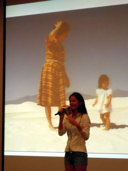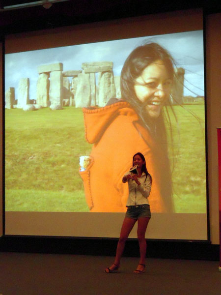 講座中,她從她小時候開始講起,一路講到她後來到世界各地旅遊所遇到的事情。原來她們家在她們長大以後,全家人就開始各自規劃自已的旅行,所到之處都帶著自己的大頭狗(家族記號)拍照留念,回家和家人分享,或炫耀自己跑去什麼景點,這時家人彼此之間就會比較,會出現以下的對話: