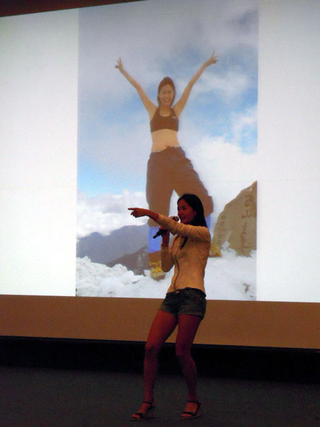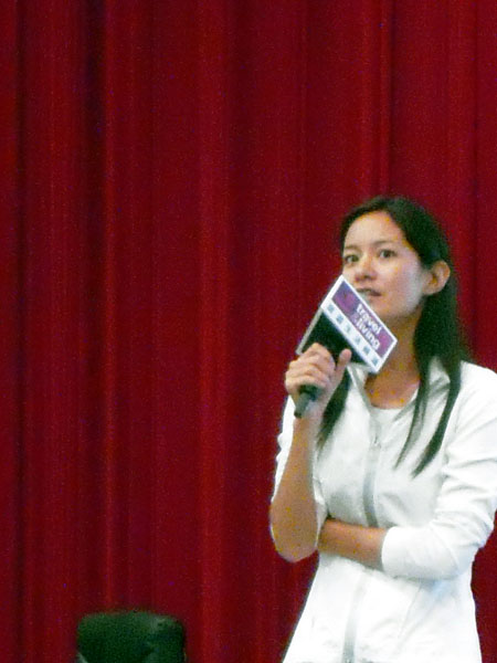 還有讓我非常記得的是,她的語言學得非常好,除了英文、台語、國語、西班牙文(大學雙主修)、法文(在法國待過一年)以外,她正想要開始學日文。但比較讓我吃驚的是,報導寫她會說五種語言,還真不是灌水。她在現場有秀了幾段西班牙文和法文,我雖然不懂西班牙文和法文,但是我很驚訝她的發音調子很準、咬字清楚,聽起來一點都不吃力,而她也秀了一句日文,也是發音標準、咬字清楚,我也不懂日文,但甚至連我都猜得到那句話的大意是在問人什麼東西在哪,果然她在後來提供了解答: