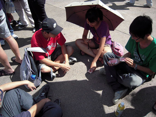 賭性堅強的台大系羽,出去打比賽時打牌打到忘記上場就算了,連在六福村排隊也要打牌