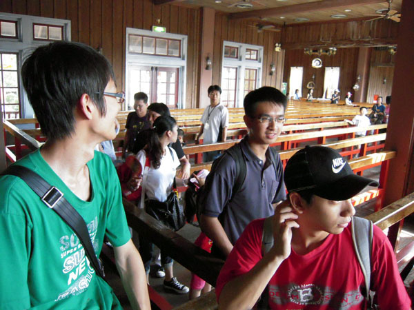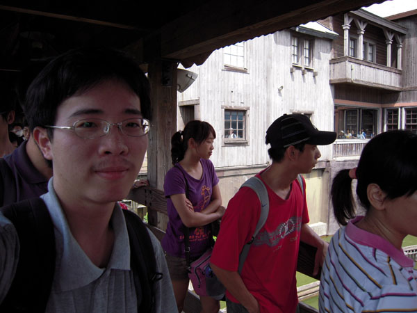 在車上補眠,兩個鐘頭以後我們到了六福村,準備趕上第一批入園的遊客。先衝往激流泛舟的地方排隊,因為趕著排隊用跑的,隊長學弟的沙士就在我們排隊時爆炸了。