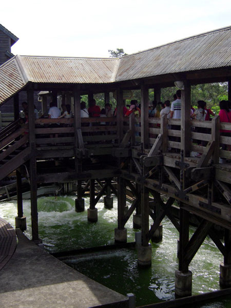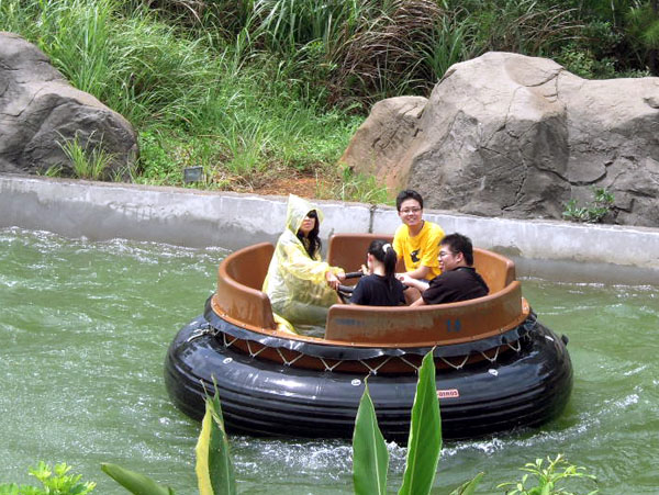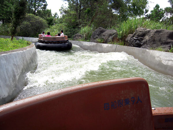 這裡是我當年高中畢旅玩的最後一站,在那個船上隨波逐流,還可以陷害同船的人被水潑到(我們當年玩到厲害到可以指定陷害某人)。但當年也有一批小學生來六福村畢業旅行,什麼不會,就只會鑽隙縫插隊,在各個遊樂設施弄得我們當年這些高中生很不爽,那時在激流泛舟這裡,一群死小孩繼續鑽隙縫,我們高中生靈機一動,則佔著人高馬大、體育又強的優勢,像輕功一般直接翻越層層欄杆抄到他們的前面,省得插隊的死小孩還在那邊左右鑽來鑽去,我們五六個連翻就先搶位了,以其人之道還治其人之身,只能讓他們乾瞪眼。據說花中畢業旅行每一屆在六福村都碰到插隊的小學生。