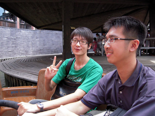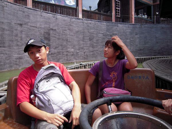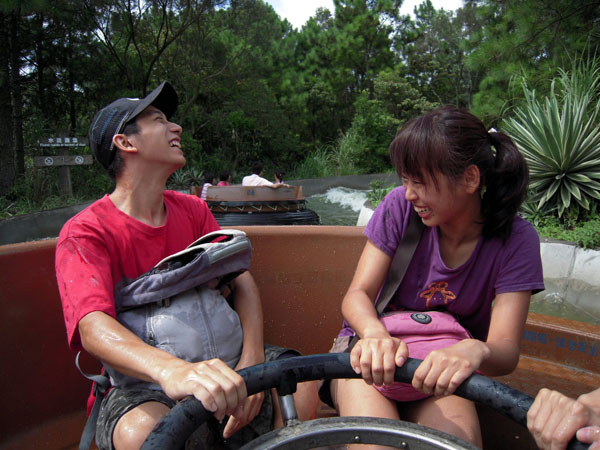 另有梅君和 Stone,搭晚一班車來六福村,我們回到岸上時,看到他們正在人群之中排隊要玩泛舟,還和我們招手。於是我們這群私下打好主意,再去玩一個不用排很久的設施,回來剛好等在岸上開炮射他們 XD。