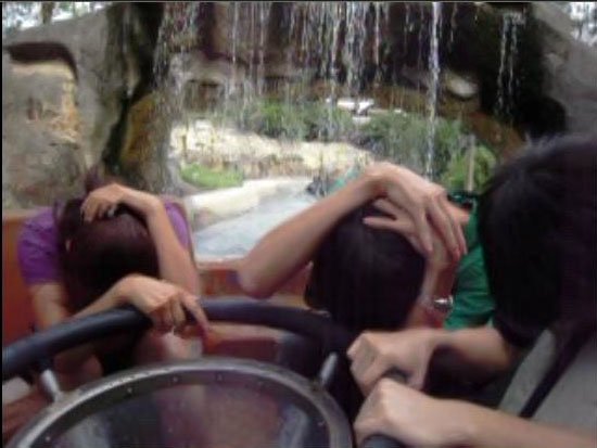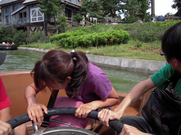 徵葳沒玩過,大家正和她討論這個設施可以怎麼暗算同船的人,就在我們背後「碰!」好大一聲(附帶的是徵葳的尖叫 XD ),岸上有人朝我們開炮,水柱隨之上衝。