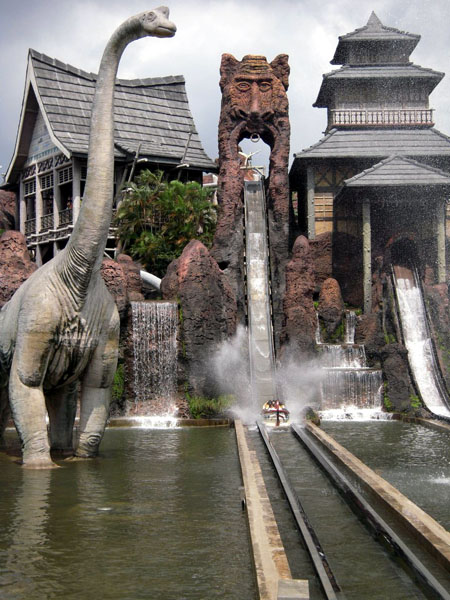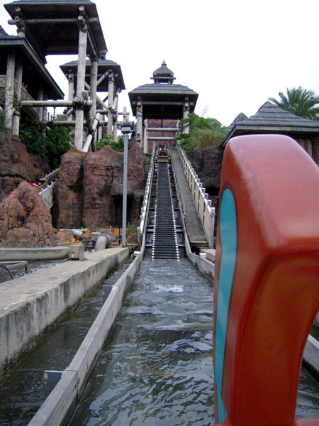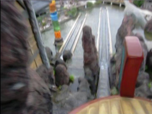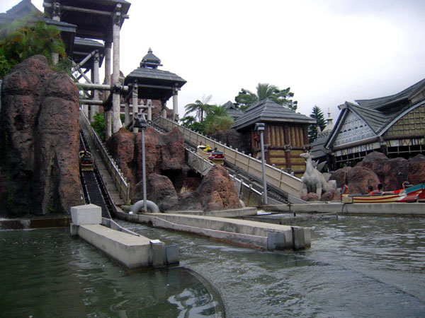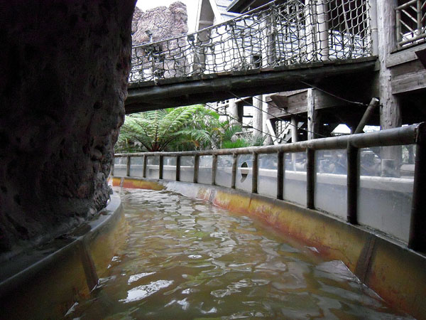 這個設施好玩的地方在於它有兩個滑水道,可以一次過兩次癮,而且第二個水道比第一個水道更高更長。過完第一個水道,船上的我們叫了一回、稍微濕了一點,繼續在水道裡邁向第二個滑水道準備等死。雖然第一次下水以後每個人表情都是同樣的衰。