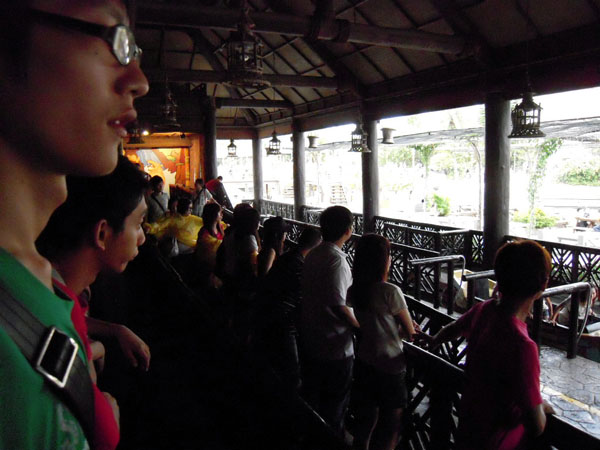 當年畢業旅行,就是在這裡因為小學生的插隊,原本排一個小時可以排到的,最後排了 90 分鐘才排到。今天沒有會插隊的小學生,我們排了 20 分鐘就上了船。結果竹子和彥廷自動跳位,要我坐第一個位子,用意是幫他們擋水。