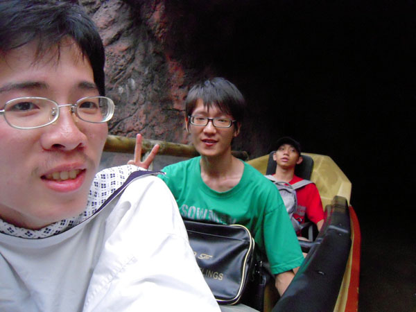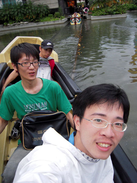 沿途山明水秀(才怪),我們在獨木舟上還很愜意的評論這評論那(我覺得最妙的是在三度空間裡能有人工的溪流,空間配置很好玩),還繼續玩自拍,不過在往後拍照時,我才發現彥廷(隊長)使詐,坐最後一個就算了,還戴帽子防水。![]()
