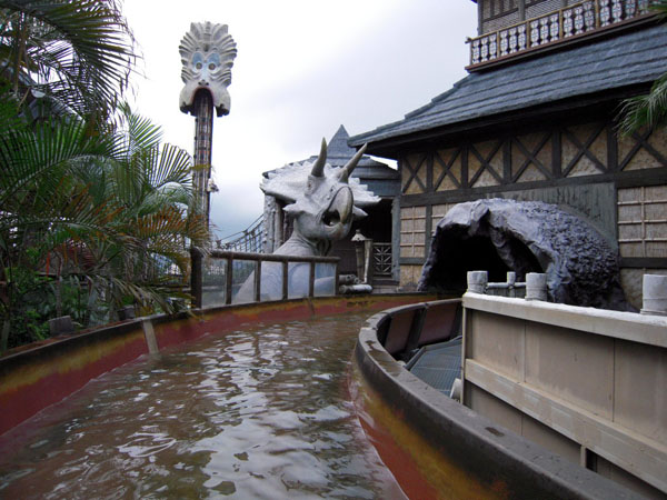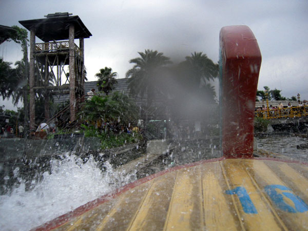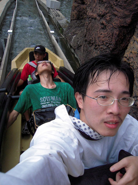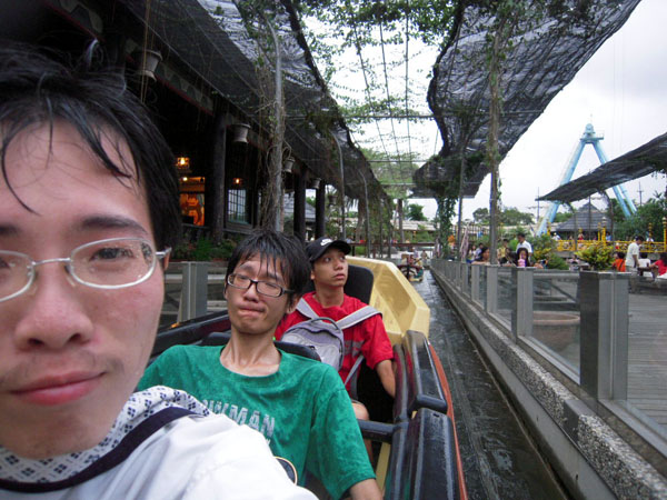 ,高中時我也是坐第一位,還記得和我同船的同班同學,後面那位還豪邁的放開手隨船下墜。這次來六福村,為了拍照攝影記錄,我只能用膝蓋扣緊船舷,上半身也是不在固定之中的。