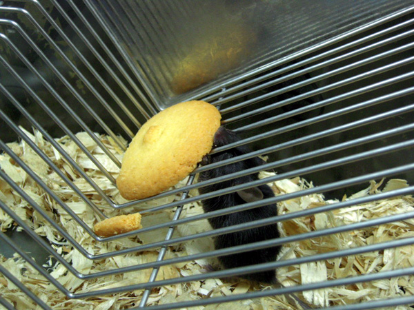 問過隔壁研究室的學長,沒發現有老鼠走失的,這隻老鼠又不能亂丟(因為 C57/BL6 常用來作基因轉殖和剔除鼠,不能外流以免干擾野鼠遺傳),又在假日期間,只好找了個鼠籠把牠養起來,然後拿了實驗室以前學姊訂婚的喜餅餵牠壓壓驚