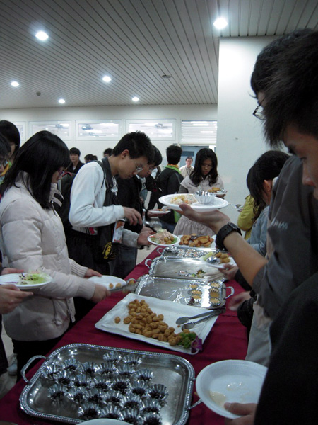 。食物很新鮮,還有不少養生餐,人參、紫米之類,彰師大雖然用外燴即時處理的方式辦,可是辦得很有誠意,也很用心。在晚會表演中,還穿插他們學生自己寫的歌,以及一堆和生物有關的歌詞,連他們系主任都意想不到。