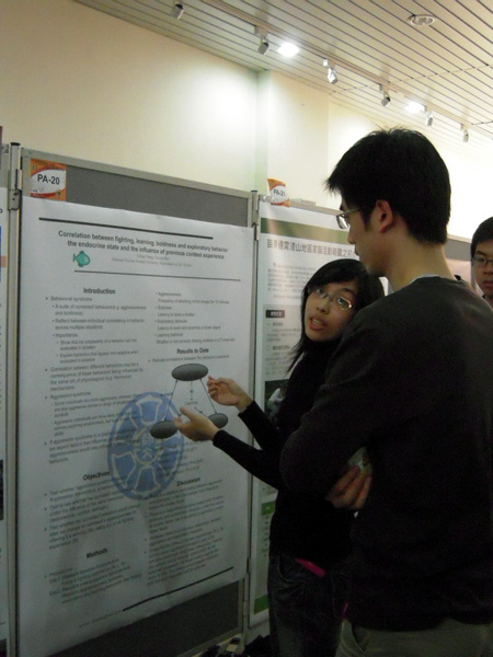 而在講解的過程中,意外發現隔壁的海報,是和我同年度在動物園實習的師大生物系學妹(現在升上生物所),她們的團隊做的,沒想到會和她們成為鄰居,左邊是她們(後來有得獎),右邊的鄰居也是師大生物所的學妹,我們被師大包圍了。