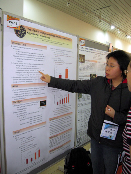 另外是到了會場才發現自己好像投錯組了。我在動物園做的動物行為豐富化,投在行為生態學那組,而今年動物園報名出的海報,都投在野生動物經營管理那組,行為生態學有 19 張海報參賽,野生動物經營管理只有 8 張海報參賽,可是去年動物園明明都投行為生態組的。