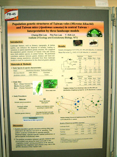 下午終於忍不住,海報解說完後,去聽了幾場演講。東海今年有人提研究台灣鼴鼠的報告,這種東西我只有在小學時看過一次,自然科的老師在整理花圃時挖到一隻,帶來課堂當作活教材,當時最大的印象就是看牠視力不好且畏光,一把抓起來,但是那個像鐵鏟一般的前腳力量奇大無比,一骨溜就從握著的手中鑽出(我有手指縫被撕裂的感覺),放牠到飼養箱裡,三兩下就鑽到土裡去,比蟑螂還快。