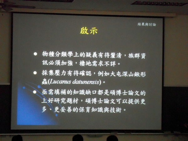 再來是老趙(林業所趙榮台老師),老趙這一兩年的團隊在修訂台灣保育類昆蟲名錄,因為上一次訂定是 20 年前,這 20 年來都沒動過。老趙他們用上類似統計學的方法,從捕捉壓力、生活史已知、分布廣度等等參數,為每種所知昆蟲訂定分數,還重新設定標準比較 20 年前與現今的差異。越高分的昆蟲處境越危險,這樣訂出來的昆蟲名錄裡,大紫蛺蝶、珠光鳳蝶、黃賞鳳蝶,仍然高居前三,所以這三種昆蟲的處境, 20 年來一直都是危險 。另外霧社血斑天牛經過調查,分數降低,沒有像以前那麼危險。