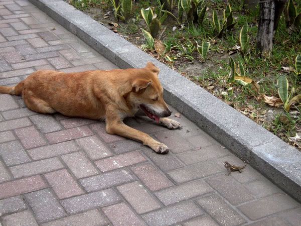 這是很典型的搜尋、盯視的行為,平常的狗不會出現這樣子的行為(趴在地上還頭朝地面注視某一特定點)。果然仔細一看,那隻狗的正前方有隻公的攀木蜥蜴,正對狗擺出威嚇姿態。
